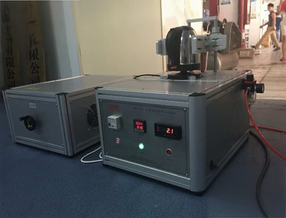 本试验机用压缩空气做动力推动机械手,模拟无绳壶在正常情况下进行提起放下、通电断电的动作,以进行寿命测试。本试验机是无绳壶生产企业用于质量控制和质量检测的必备试验设备。