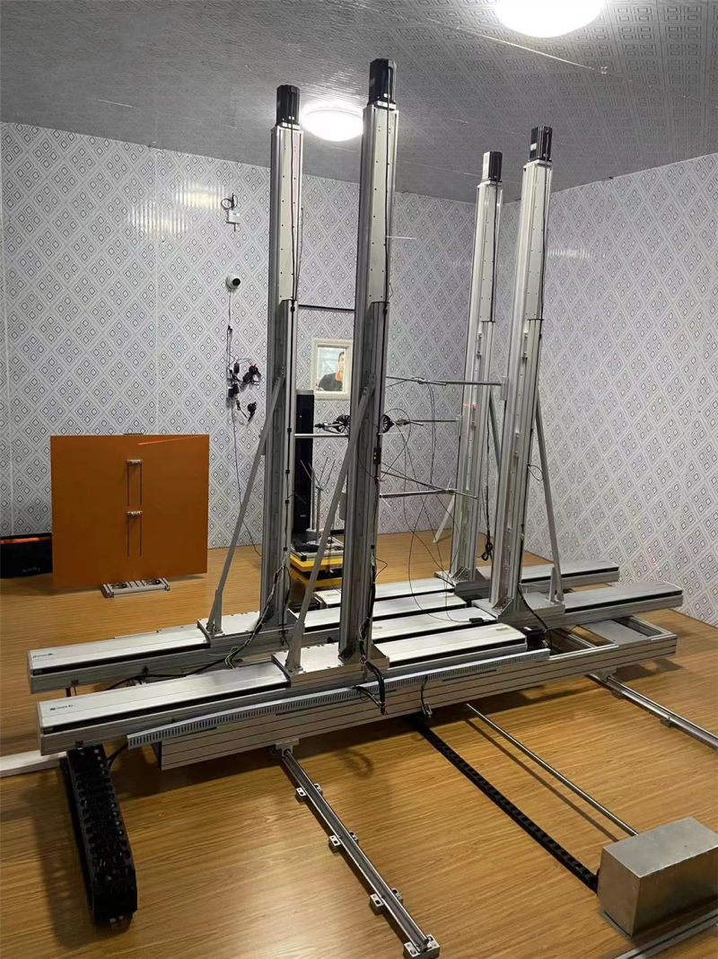 电风扇风量测试系统依据国标GB/T 13380-2015《交流电风扇和调速器》附录A建造的,满足GB/T 13380-2015《交流电风扇和调速器》和GB 12021.9-2008《交流电风扇能效限定值及能效等级》的要求,为了行走方便,并且因为测试方法基本一样,能符合台扇、璧扇、台地扇、落地扇及吊扇等风量测试要求.采用四个风速表采集风速(测试平面有原有2个水平风速表的基础上在垂直方向增加2个风速表)来代表同一圆环上的平均风速。