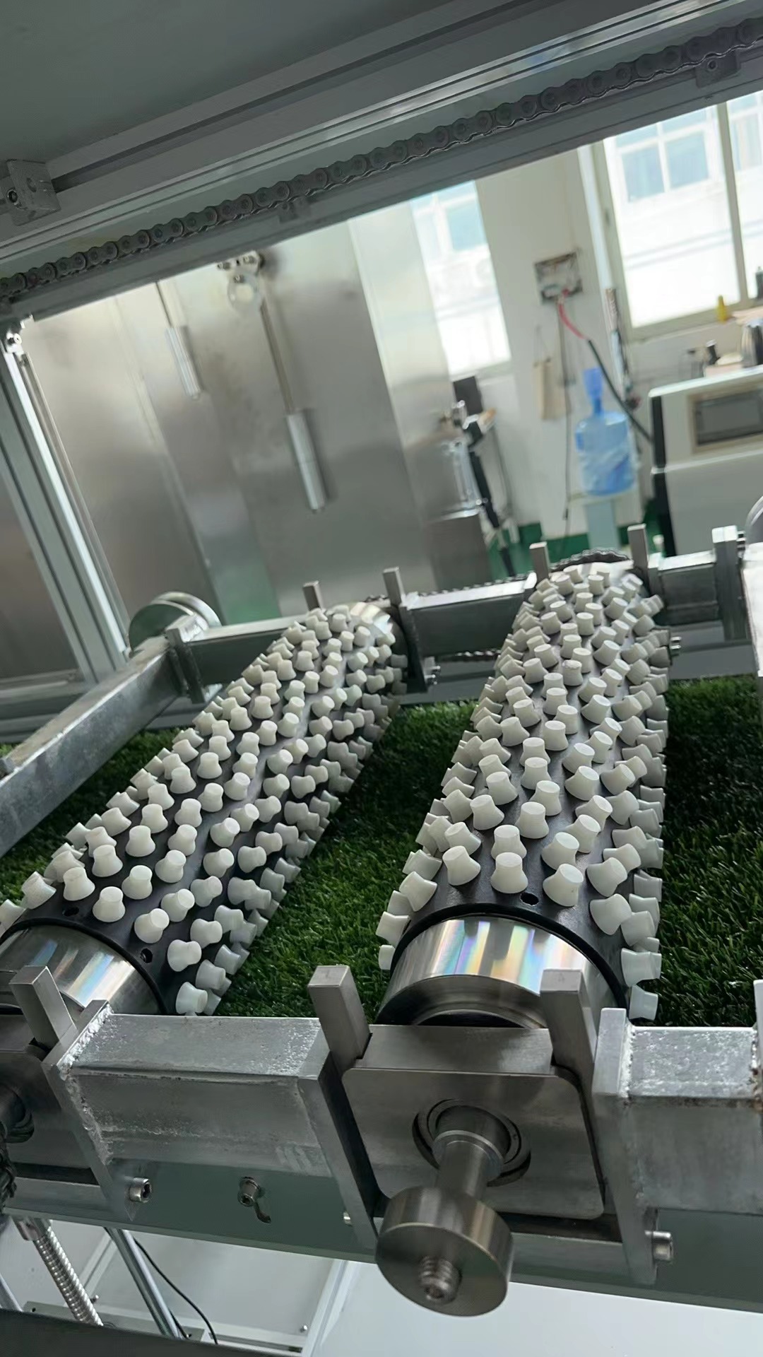7. 辊筒要求:2个300mm长,双辊筒;前后各一个;滚轮直径118±5mm,每个滚轮重(28500±500)克(含滚轮、鞋钉和轴),鞋钉数量:145±5个,特别设计的自带鞋钉柱状磨损辊筒;